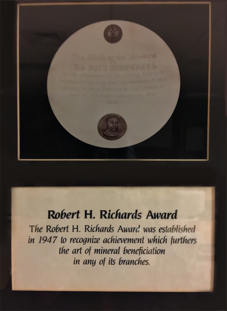 The Robert H. Richards Award, established in 1948, recognizes achievement in any form which unmistakably furthers the art of mineral beneficiation in any of its branches. This award is administered by AIME Member Society, SME. For more details, visit the SME Robert H. Richards Award page.